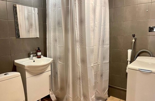 Layout: Kitchen(wood cooker, cooker(electric), coffee machine, microwave, fridge-freezer), Living/bed room(double folding bed, radio, netflix), bedroom(2x single bed, single folding bed), bathroom(floor heating)(washbasin, shower, toilet, washing machine), balcony, heating(electric), garden, garden furniture, parking, high chair, air to air heatpump