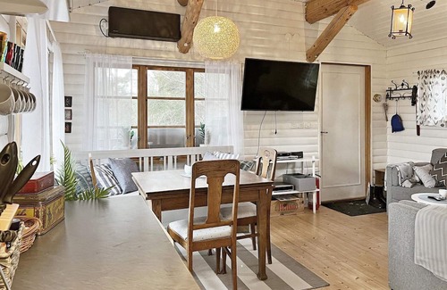 Welcome to a cozy house on a nice natural plot with a location close to the sea on Svärdsö in Nynäshamn municipality. Here you come far out into the sea belt, with only 200 m to the sea no matter which direction you go, here the water is clear and beautiful. In one direction you will find a lovely beach and rocks, in the other direction tables and chairs down by the water. There you can take a basket of food with you and enjoy the fantastic sunset and take a dip in the sea. The house has one bedroom with a family bunk bed, separated by curtains. Sofa bed for two is in the living room. In the living room there is also the dining table and a smart TV. A fresh bathroom with electric toilet, sink and shower. The small kitchen has access to the balcony, where you will find a gas grill and outdoor furniture. Parking for cars is available below the house. There is a gate down by the road that you get a key to drive the car up to the house. You share a plot with the nice owners, but have plenty of your own plot space and no visibility. Nynäshamn is a cozy summer town, the bus there goes just below the house. On Torö, which Svärdsö is close to, there are cozy summer cafes and restaurants if you don't want to cook yourself.