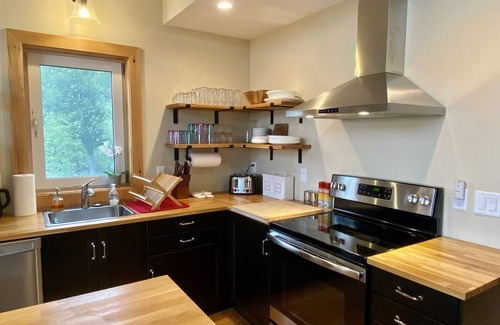 The home is set high off picturesque Intervale Road on 30 quiet acres of land and boasts 1900 square feet across 3 floors. This three bedroom plus bunk nook vacation rental enjoys a mix of modern facilities, high-end leather and wood furniture, and rustic hand-made décor. The home is perfect for a family getaway or a weekend with friends.