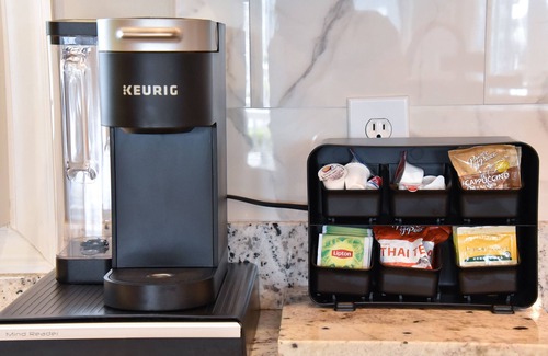 Complimentary continental breakfast, coffee, tea, and water. It also includes paper plates, cups, napkins, and silverware, as well as a well-appointed kitchen with dishes, wine glasses, and silverware.