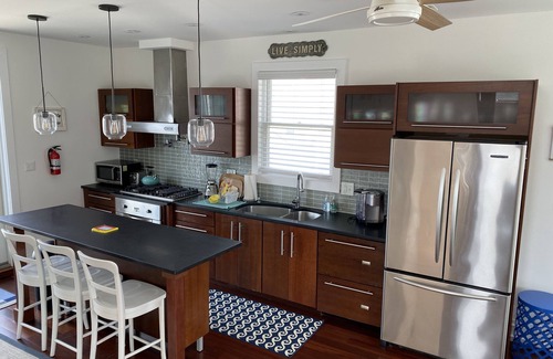 (for more information or to get a hold of the owner go to judybkahnatgmail) This 14-year-old three-level contemporary directly across from the beach and ocean accommodates 1-2 families easily. You will step out of your house, take a few steps, and find yourself on a pristine life-guarded beach! There is wireless Verizon Fios Gigabit internet which super-high speeds throughout the house. This beach home is appointed with 100% brand new upscale furnishings from Pottery Barn, Crate and Barrel, West Elm, and World Market. No expense has been spared in remodeling this home and transforming it into a dream beach house. Lower level includes: large family room with couch and leather recliner, television, table and chairs; brand new spa bathroom with oversized shower and washer/dryer; 2 bedrooms with queen beds.