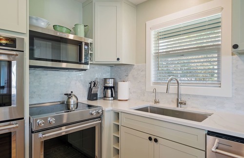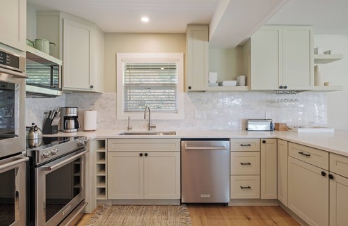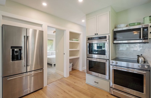 Fully equipped kitchen boasting three ovens, ideal for preparing large meals and holiday feasts.