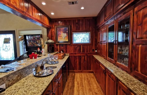 Relax with the whole family in 36 acres one hour west of Houston, 30 minutes from Round Top. Main home has 3 BR and 2-1/2 baths. Huge central area with kitchen, formal dining, family room, wonderful bar, shuffle board, pinball, jukeboxes. Freshly built guest house has 2 BR, 2 baths, small kitchen, large tv with high-end reclining theater seats. Hiking trails, stocked pond, outdoor kitchen and sitting area. Beautiful swimming pool. Outstanding views