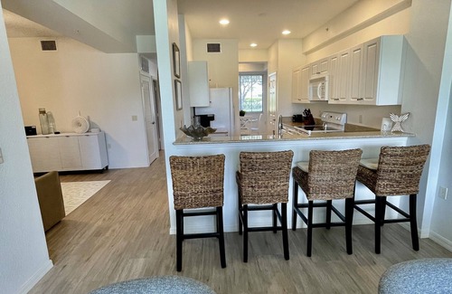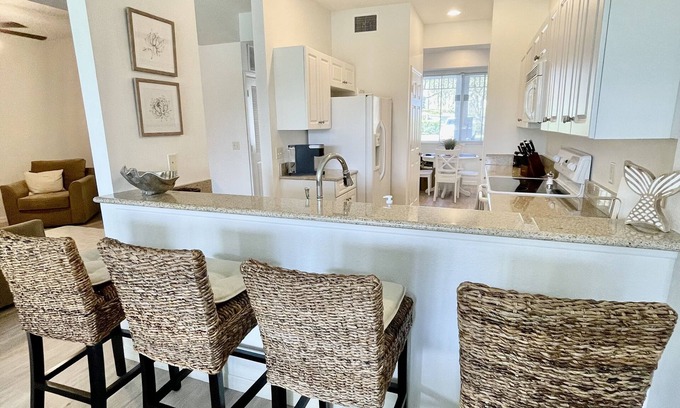 Our super clean and inviting condo was just updated with all the amenities that you would need in your home away from home. The condo has a comfy breakfast nook as well as a high top bar counter for easy entertaining. The kitchen is well appointed with plenty of dishes, glasses and pots and pans. A brand new Keurig coffee maker will help kick start your morning. Relax inside or outside on the lanai overlooking the relaxing views of the water fountain.