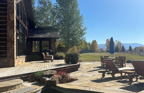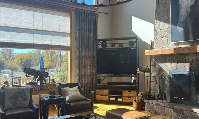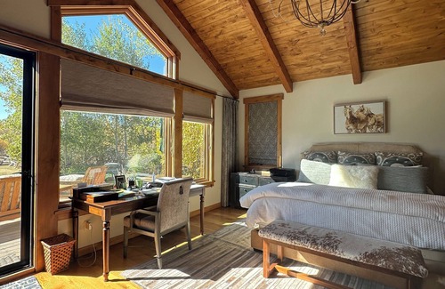 Upon arrival, country roads lead guests to a long driveway in Shootin’ Iron, passing the on-site caretaker’s cabin before reaching the grand main home. With its sturdy log beams and stonework, this place blends right into the magical mountain views. Quiet murmurs of the Snake River bring peace and wonder as you step into a home as grand as the Tetons. Vaulted ceilings create an expansive, open feel, while the great room shares the true joy and heart of mountain living. Gorgeous furniture sits around the towering stone fireplace, and the widescreen television is perfect for a cozy night in. Floor-to-ceiling windows flood the space with sunlight, and during the summer the attached patio is the place to be for outdoor dining and family barbecues. There is even a custom in-ground hot tub for epic stargazing, and a fire pit for s’mores and conversation.