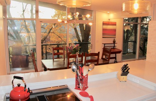 Lower level offers additional amazing views with a large, comfortable family room (with TV) and a kitchenette adjacent to large floor-to-ceiling sliders to an extensive back patio and deck for entertaining with large outdoor dining area (with beautiful large redwood table that comfortably seats 10 adults). Lower level has two bedrooms: one with a queen, and the other with two double beds, in addition to a trundle as an optional third bed.