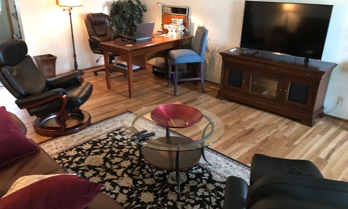 This vacation rental is the entire left side home, about 1,000 sq feet with 2 bedrooms, 1 very 50's mostly original bathroom (seriously, pink and white!), beautiful hardwood flooring, BIG TV in living room, smaller TVs in bedrooms, cable, high speed internet, large front and back yards (not fully fenced), attached garage available only on request, with stay over 2 weeks. Washer dryer IN the house, radiate heat with t/stat in each room, wall A/C in living room only, ceiling fans in both bedrooms, nice upscale furniture, desk work area in the living room, sitting space in backyard, walk-able to activity trail, lake, downtown and close to transit line.