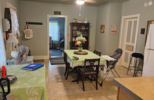 Three bedrooms (two with Queen Beds and one with 2 twin beds) and 2 bathrooms (one on the first floor and one upstairs) provide for a comfortable stay for up to 6 people. Fully equipped kitchen allows eating at home if you wish. Your at-home dining area choices include in the kitchen or on the front porch or even the original "formal" family dining room.