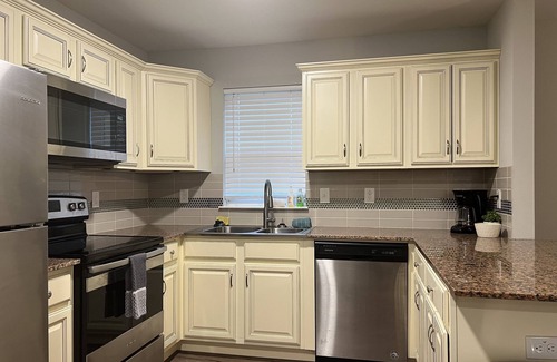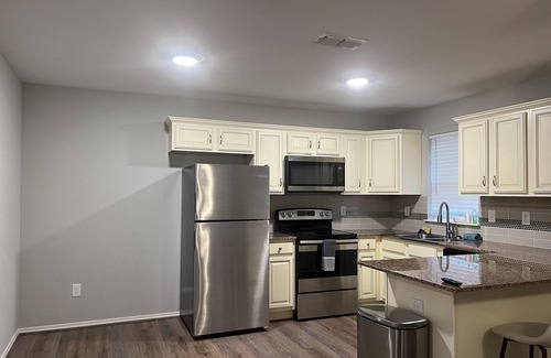 Built in 2019 this cozy 2br 2ba home has off-street parking, top of the line appliances, w&d, near UAMS in the heart of Little Rock. Living room and kitchen furnishings.