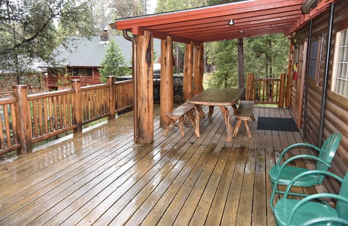 Tuolumne Meadow is a gorgeous,2 bedroom, 1 bathroom (with a jetted tub) home that sleeps up to 6 guests. The fully equipped kitchen has granite countertops, and a gourmet Wolf range, and includes a dishwasher. The private deck has a very large, picnic table and a built-in gas grill. Attention to detail describes the features of this home with ceiling fans, forced air heat, a beautiful rock fireplace (wood provided in season), a vanity sink in the master bedroom, flat-screen satellite TVs in the living room and in both bedrooms as well as WiFi. There are plenty of movies, books, and board games. Can be rented as a one-bedroom (Call for details). No Pets Allowed. Does not have air conditioning. EV charging station available within five miles of the cabin.