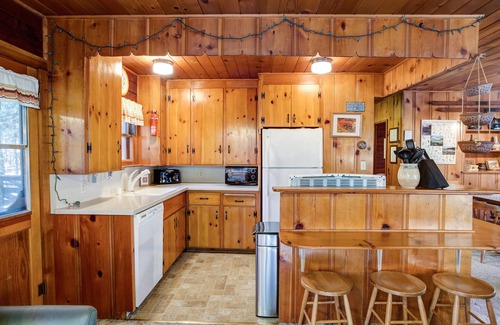 Creekside Cabin is a cozy 2 bedroom, 2 bathroom, cabin that sleeps up to 6 guests. The kitchen is fully equipped, including a dishwasher. The living room has a fireplace (firewood provided in season), Sling TV, and WiFi. The partially covered deck has a gas BBQ, a picnic table, and a table with an umbrella & chairs - perfect for grilling and eating your favorite meal outside in the fresh mountain air. This home is *pet-friendly. "EV Charging Station available within five miles of the cabin"