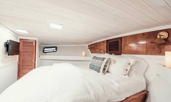 The boat has recently been completely restored - here you will find quartz countertops and beautiful woodwork throughout. The interior boasts a beautiful salon and galley with views of the harbor in every direction. The pilothouse, or mid-ship, is outfitted with a wine fridge and cappuccino/espresso machine. In addition to these amenities, enjoy sweeping views of the harbor from above deck, BBQ and lounge on the many exterior decks (season permitting), and spend time kayaking around the harbor in our complementary kayaks.