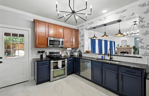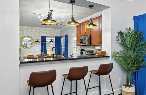 Step into this space and let our southern hospitality wash over you! Tastefully furnished with an oversized sectional, an accent wall with southern motifs, and designer decor, you’ll find yourself immediately relaxing as you soak in the backyard pool views.