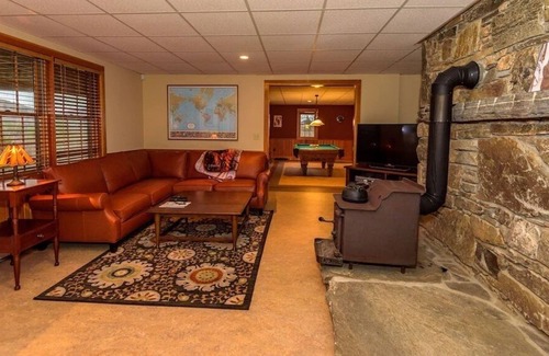 Relax in the spectacular Classic Vermont-themed lower level which features a family room with leather sectional sofa and 48 inch flat screen TV and woodstove with stone hearth, a full wet bar with seating and a huge game room that includes a pool table, dart board and ping pong table.