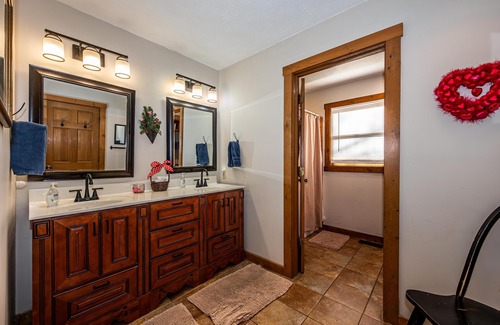 Back inside, explore the master Green Bedroom on the main floor that features a king sized bed, walk-in closet, and 32" flat TV with Youtube, prime and Netflix. There are also French doors out to a private corner of the porch equipped with two porch rockers. The adjoining Bath gives you the luxury of a 2 sink vanity and separate bath area. The Red Bedroom across the hall also features a king bed, ample closet, and flat screen TV with Youtube, prime and Netflix.