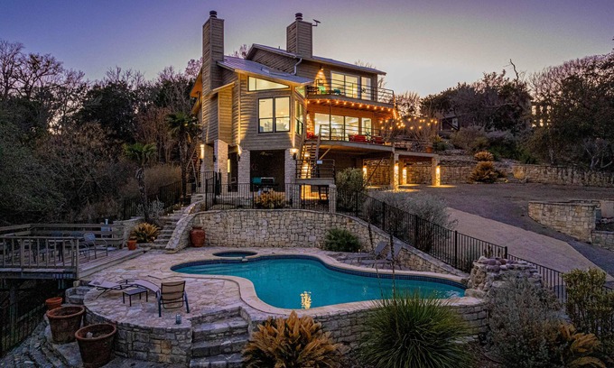 This unique 5-bedroom home in Spicewood, TX is the perfect retreat for families and groups alike, with a private pool with stunning Hill Country views.