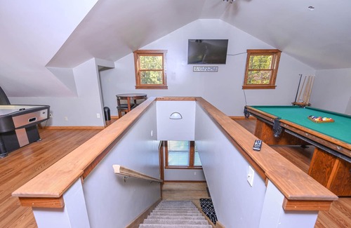 3rd floor is a large rec room with a half bath, pool table, air hockey, foosball and a 2 futons.