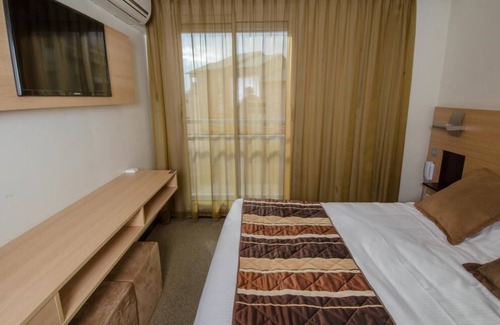 • Living area: Double bed, flat-screen TV, desk, dial phone, suitcase stand, and storage space
