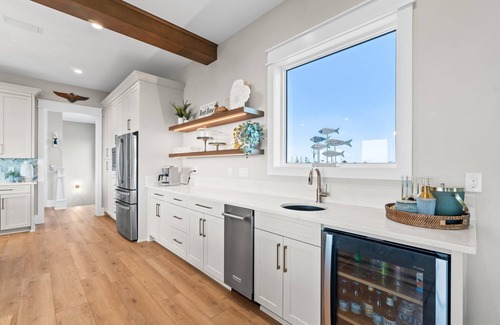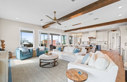 Kitchen, Dining and Family Room with smart TV, ice maker, beverage refrigerator, direct access to gulf-facing deck