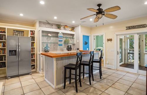 LOTS OF LIVING AREAS - Plenty of room to spread out on both floors. Enjoy watching TV, playing games, listening to music, etc. Each floor has a half bath. The 1st floor has a built in bar with stools and a side by side refrigerator. Spend time relaxing on the front porch in rocking chairs, or on the screened in porch on the first floor overlooking the beautiful backyard. 3 of the 4 bedrooms on this floor have direct access to outdoor space! From the top or 2nd floor, enjoy the porch on the front of the house in comfortable outdoor furniture. In the back there is a sundeck with furniture which overlooks the pool and backyard. This is a perfect spot to get away from everyone and read a book or take a nap. And don't forget the Cabana around the pool, with lounge chairs, a sectional couch and dining table.
