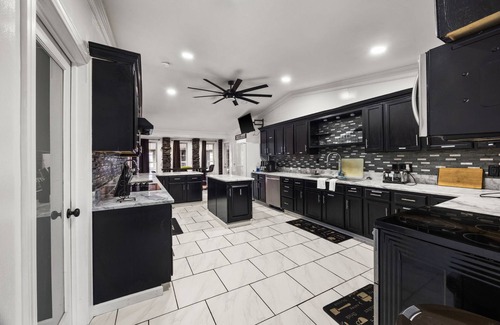 Full-sized kitchen not only comes with a standard stove/oven, but also an additional stovetop; along with a large refrigerator, two deep sinks, microwave, and dishwasher. Other smaller appliances include an air fryer, blender, mixer, and coffeemaker (K-cup compatible).