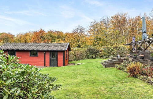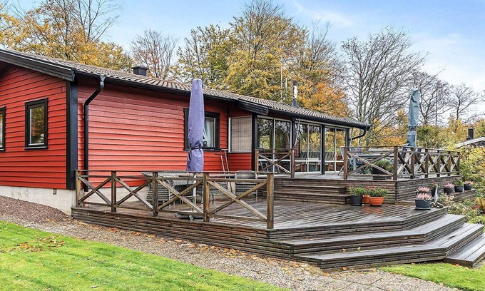 Welcome to a cozy holiday home in a very nice forest area with swimming and fishing opportunities. The cottage is located in a smaller holiday home area and here you will experience the peace and quiet with the forest at your fingertips. A perfect accommodation for nature lovers and families with children with proximity to all attractions on the Bjäre and Kulla peninsulas. The entrance to the cottage is at the back. First there is a spacious bathroom with shower. The kitchen is open with a dining area and next to an open room that has a pull-out bed with two beds. There is also a cot. The living room is bright with large glass panels and access to the outdoor room. Here there is a comfortable sofa and a stove to make a fire in if you stay here on a bit chilly days. The bedroom has a generous double bed and here there is also access to a terrace that gives you morning sun and a little coolness in the evening. The glazed outdoor room has comfortable seating. At the front of the house you have a very spacious terrace on two levels with several lovely outdoor furniture and a charcoal grill. Part of the terrace has a large awning. In part of the adjacent garage building there is a guest room with a spacious family bed. The plot is beautifully nestled by lovely flowering shrubs and has the forest as a neighbor. The lawn offers space for all the family's activities. In the area there are nice walks on landscaped paths in the forest around the cottage. Nearby there is a community facility with an outdoor pool, tennis court and playground. The pool is only open in summer. There is a sauna in the ladies' and gentlemen's changing rooms. Follow the instructions and prompts on the plastic. Right next to the cottage area is Lake Västersjön and here there is a great public swimming area with a bathing jetty, changing rooms and barbecue areas. Lake Västersjön has a good fish stock of pike, zander, perch, tench, bream and eel. A fishing license is required. You can also rent a boat here. Enjoy coffee and a lovely view of Lake Västersjön. Nearby is Djurholmen Nature Reserve with several nice hiking trails and coffee and barbecue areas. Just on the other side of Hallandsåsen is Vallåsen where you can ski in the winter and cycle downhill in the summer. At Kungsbygget you can go tobogganing in the summer. Visit the Bjäre and Kulla peninsulas. Here you will find lots of nice excursion destinations and hidden gems. A short drive away is the beautiful town of Ängelholm with small, cozy shops, the beautiful local park and its long beach. This cottage is not rented to youth groups.
