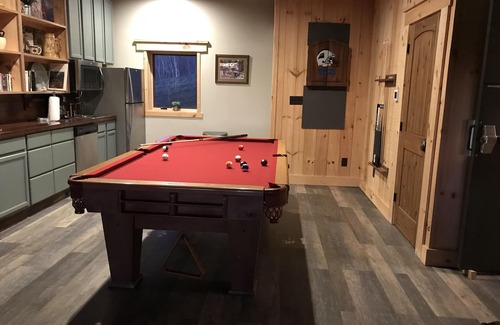 Walk from the 15 car parking area directly in to the cabin with no steps to climb. Two queen bedrooms on the left have easy access to the large ADA accessible bathroom on the right. The loft above is set up for kids with a play area, a Playstation and 2 foldout beds. Cross through the great room with huge stone woodburning fireplace and 60” 4K TV to a King master with 6 ft Jacuzzi tub and separate shower. Descend the stairway to the lower level through a large gameroom with 8 ft pool table, kitchenette, and movie watching area with covered patio and mountain views. A King master on the right has the 2nd 6 ft Jacuzzi tub in this house. A large bedroom on the left with King bed and bunkbed is great for kids or the hallway door can be locked, making it a 3rd king master suite. Outfitted for cooking holiday meals. Between the kitchen on the upper level and the kitchenette on the lower level there are 3 ovens, 2 refrigerators, and 2 dishwashers. There is a wood table in the main kitchen that seats 6 when expanded and 3 folding tables that seat 4 each. For large gatherings we have the pool table fitted with a topper and vinyl cover so it can be used as a banquet table.