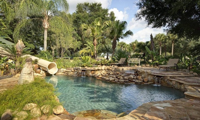 Its lazy Southern style porches are complemented by over-the-top luxuries and eccentricities like carousel horse rides, indoor and outdoor billiards tables, game rooms, video arcades w/ full-sized game machines, air hockey, foosball, table tennis, horseshoes, tetherball, private mini golf, extensive mural work, fairy tale theme, indoor AND outdoor movie theaters, hot tubs, playgrounds, a water park-style slide into a lagoon themed waterfall pool, a 2 story indoor slide into a recreation room, and so much more!