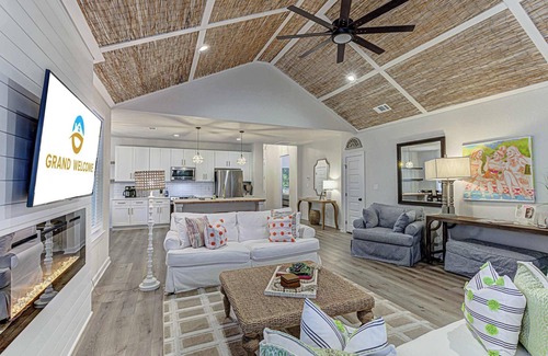 Head next door to Lakin’ It Easier and discover even more room to relax. Here, a large sectional anchors the living room around another smart TV and fireplace, ideal for movie nights or game sessions. The open kitchen mirrors the style of the first—white cabinetry, stainless appliances, and a coffee station—and connects effortlessly to a round dining table for six and counter seating for three. A private covered patio provides a quiet retreat, while access to the shared sparkling pool just steps away makes it easy to cool off on warm Texas afternoons.