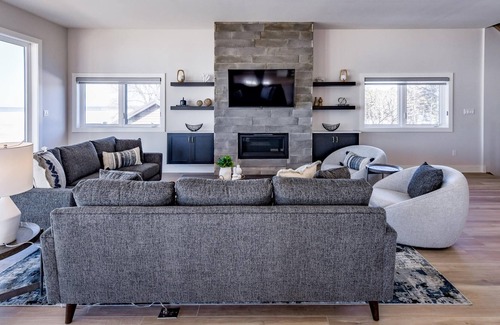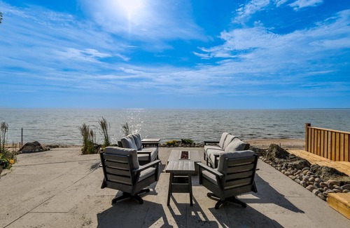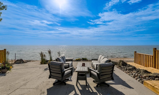 Cottage with Beautiful Sand Beach and Sunsets in Tiny Township - Jaw-dropping views of the magnificent blue waters of Georgian Bay await you at this four-season, luxury getaway with its bright southern exposure and water-facing, floor-to-ceiling windows. Bask in the sun, relax and get away from it all at this contemporary beach house, where you can step right out onto the sand, and walk for miles along the stunning Caribbean-like beach! Enjoy sipping your morning coffee on any 3 of the decks, or on the beach while the kids make sandcastles! A beautiful beach patio features slate grey Tofino (heavy resin) outdoor furniture which includes; a sofa, two love seats, two swivel chairs, and end tables all surrounding a brand new, natural gas Hampton fire table! No docks and minimal powerboats make for a serene escape.