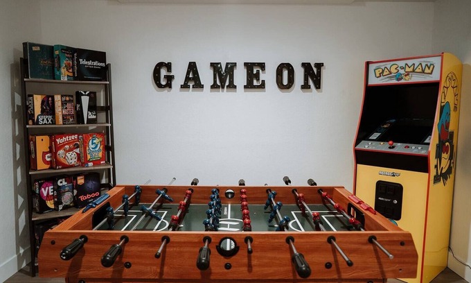 The lower-level game room is the heart of indoor fun. Watch a movie on the 100-inch projector, challenge friends to foosball or Pac-Man, or unwind with a round of checkers or a few putts on the mini green. Upstairs, the lounge invites you to settle into a plush sectional, warm up by the electric fireplace, or watch the Smart TV after a day of adventure.