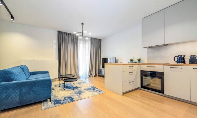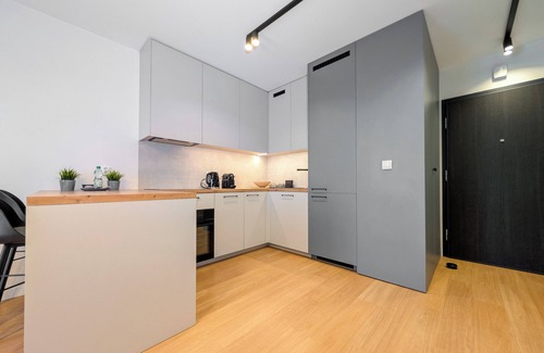 6th Floor Studio with the River View features a stylishly decorated living room with a sofa bed and a kitchenette, a bathroom, and a balcony offering a stunning 6th-floor view of the Oder River, where guests can relax and enjoy their morning coffee or an evening glass of wine. Guests have access to a range of practical amenities including free Wi-Fi, a TV, washing machine, hair dryer, iron, dishwasher, oven, fridge with freezer, induction hob, Nespresso coffee machine, kettle, and kitchen accessories. A parking space in the garage is also available for guests. The building offers a modern gym, which guests are free to use during their stay – a great option for those who enjoy active relaxation.