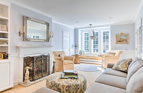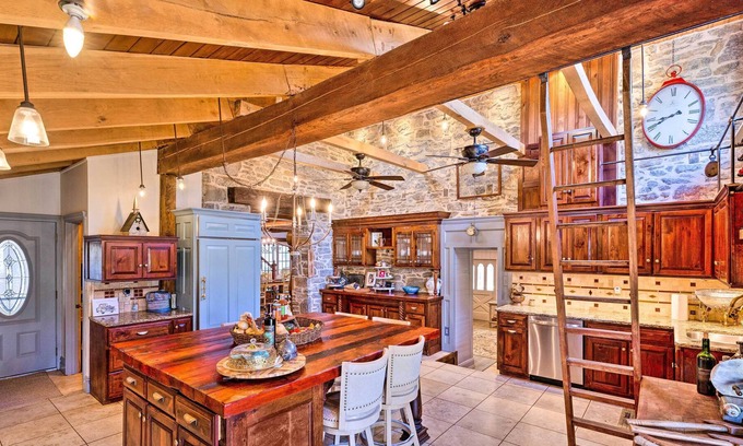 Experience Easton, PA, from this grand manor! This 4-bedroom, 3.5-bathroom vacation rental offers 2 guest homes to accommodate your group, both providing a storybook feel to take your stay up a notch. Revel in the stone interior complete with a stunning chef's kitchen, inviting bedrooms, and multiple living spaces. Or, step outside to enjoy the outdoor bar, or the seasonal pool. You'll even have access to a barn that features a game room, pub area, movie theater, and fitness room.