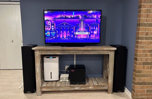 Basement Living Room offers two full sofas, a bar rail with 4 Stools and kitchenette to offer a completely separate area to entertain. A smart TV and Sound system will keep this group busy for hours.