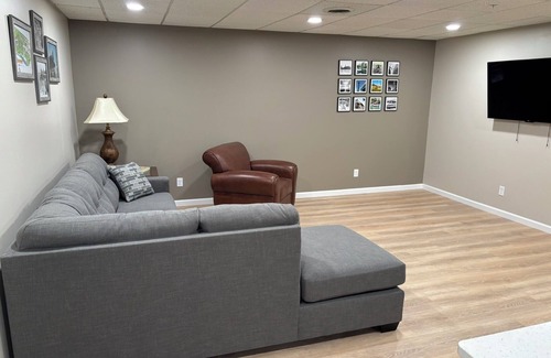 For even more family fun, prepare meals, pancakes, popcorn, sandwiches, and fresh-brewed Keurig coffee in our fully equipped kitchen. The spacious living room features a sectional couch and TV, perfect for relaxing after a long day of adventure.