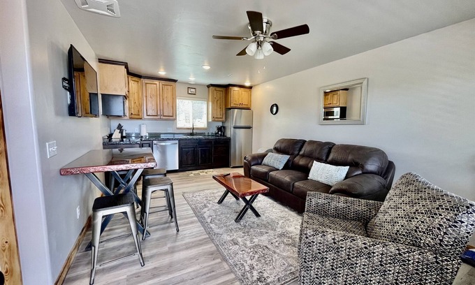 Discover comfort and style in our new, inviting townhouse near downtown Moab. Ideal for two people, Angel Rock Rentals of Moab offers a refreshing escape just 4 miles south of Moab. Unwind in a cozy queen-size bed, cook in a well-equipped kitchen, and utilize the electric patio grill. Securely store your gear in the garage.