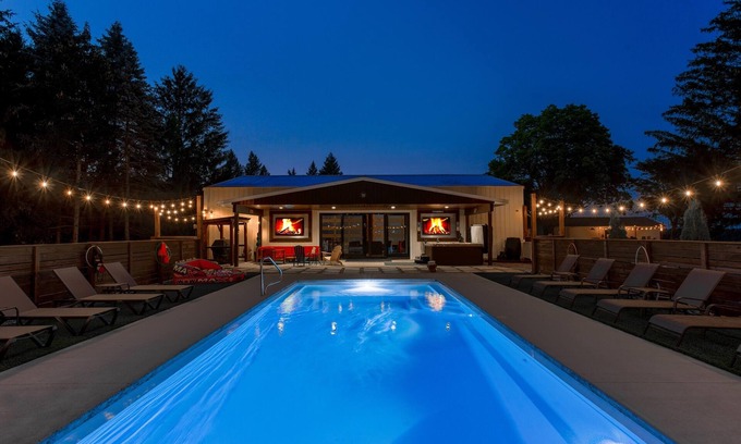 'The 70's Lodge' is a sprawling 9-bed, 5-bath vacation rental home that's been recently updated with a groovy 70's theme. With a newly installed 2,000 square foot rec room, private seasonal inground pool, 2 hot tubs, Sauna, on-site trail, and its own 'Tiny Ranch,' this spacious property can sleep 29 guests comfortably. Indoor and outdoor spaces to play, grill, and relax make The 70’s Lodge ideal for groups and families in need of a getaway.