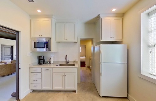A convenient kitchenette is equipped with a full-size fridge, a sink, a microwave, and a coffee maker. Two of the guest bedrooms feature their own Keurig coffee makers for ultimate morning brew convenience. The breezeway-style living area features barn doors on either end of the space that create the perfect blend of indoor/outdoor living. Challenge your guests to a few rounds of Ping-Pong or relax while enjoying casual conversation around the sitting area. Multiple smart TVs are equipped for flexible home entertainment.