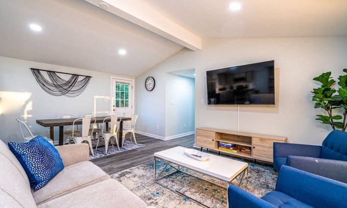 This home has everything you will need for a comfortable and relaxing stay. Equipped with Fiber Internet with speeds up to 1000 MBPS, you can work from home or relax on the couch and stream your favorite TV shows on one of the 65" Smart TVs. Kitchen is fully stocked with cookware, silverware, and more for you to make a delicious home cooked meal. Stay with us with peace of mind as we have taken extra precautions and adopted enhanced cleaning procedures in our fight against COVID-19