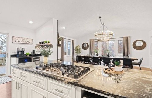 - Huge renovated kitchen with gas range, double wall oven, wine cooler, and everything you need to prepare large meals, with bar seating for 4