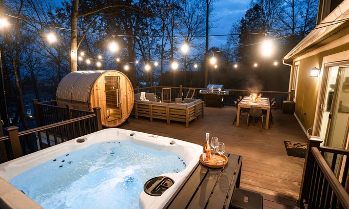 - Oversized deck with brand new 7-person hot tub and adjoining bar, 4-person cedar barrel sauna, dining table for 10, lounge area with plenty of seating around the propane fire table, and gas grill (propane provided). Seasonal views of the Shenandoah Ridgeline