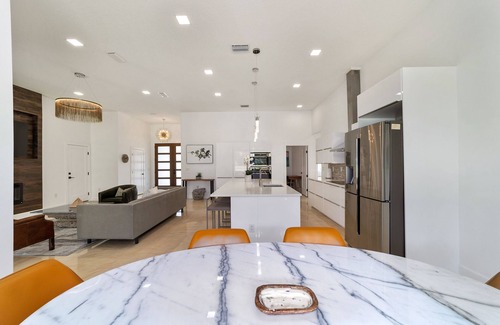 This NEW construction modern home is 7 minutes away from the World Equestrian Center, 20 min away from HITS and many different shoppinge, dining, and grocery options. 20 min away from famous Hot Springs & Swampy's and 10 minutes from the new FAST Aquatics Swimming Center and 25 mon from Ocala Horse Park. This gorgeous fully-furnished rental features 4 Bedrooms, three rooms with king beds and one room with 2 queen beds, sleeping a total of 10, plus 3.5 Bathrooms with a soaker tub in the master & 3tv's. High ceilings, privacy, beautiful landscaping, and so much more! As you enter the foyer, you are greeted by 13' ceilings in the modern great room with powder bath, adjacent is the open concept kitchen and dining room that leads to a covered patio with views of the forest preserve. The 1+ acre lot also has backyard, fenced for dogs, and outdoor dining with BBQ grill. The entire property is very private and the home is tastefully furnished with internet and smart TV's. It features TWO Primary Bedrooms on opposite sides of the home with attached bathrooms, plus two additional large bedrooms that share one bath. The large eat-in kitchen showcases modern cabinetry with a massive entertaining island that seats 5. Lastly, the fantastic driveway leads you to a two car garage with ample parking for up to 4 cars for your guests. Don't miss out on this tremendous home for your trip to Ocala! *ALL New 2022 Furniture, paint and mattresses. (No motorhomes or RVs allowed, no parking on the grass).