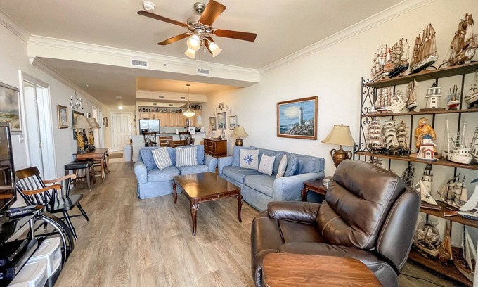 Unit 711 Nature lovers, Dauphin Island and this Holiday Isle unit is for you. Luxury Gulf-front, this unit is on the top floor in the center of the building, directly over the outside pool. It is one of two units that has an outside entrance to the 7th floor lobby. This lobby has a very large sitting area, and a large plate glass window that has a very pretty view of the bridge, and entrance to Dauphin Island. It is very handy for handicap, and older people, as in my wife and my case. We have Wi Fi, cable TV, and a large CD collection. This 7th floor condo sleeps 6 in a 2BR/2BA unit. Master bedroom has a King bed and balcony access. 2nd bedroom has a queen Bed. There is also a Queen Sofa Sleeper.