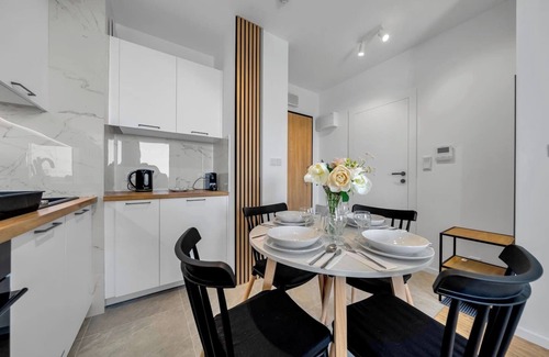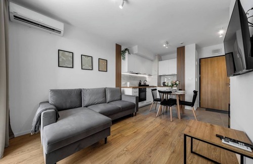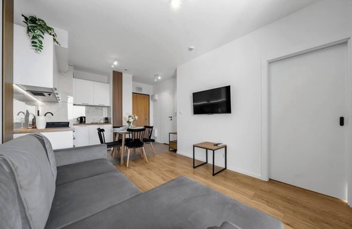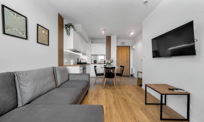 Welcome to your modern and cozy 32m² apartment on the 7th floor, perfectly designed to accommodate up to 4 guests and managed by Rentujemy. This thoughtfully laid-out space features two inviting rooms: a bedroom with a comfortable queen bed and a living area with a versatile sofa bed. Ideal for both leisure and business travelers, you will find a working desk, allowing you to stay productive during your stay.
