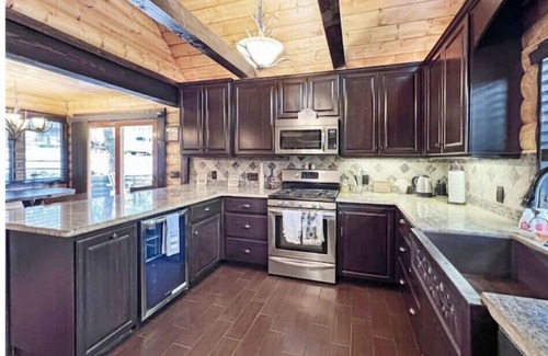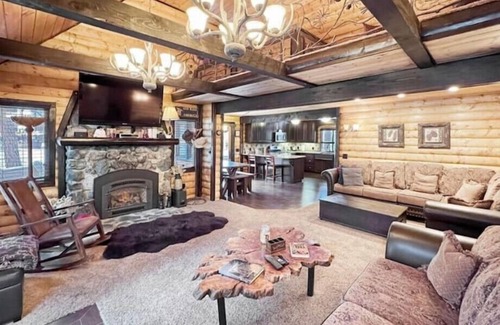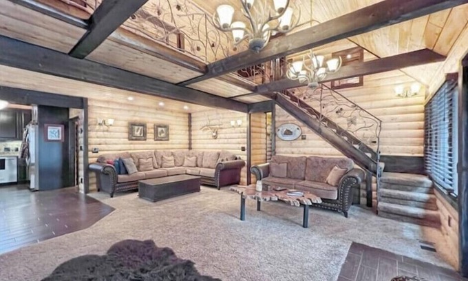 It offers four bedrooms with queen size beds, 2 full baths, sofa bed in family room and a king size lounge bed in loft. Cabin is equipped with wifi, laundry room with indoor washer and dryer. A.C and heating throughout. Family room, loft and master bedroom is equipped with there own smart t.v. Upstairs offer’s loft with masterbedroom and private bath. Baby gates are installed on stairs since safety is our priority. This Cabin is perfect for that family or group of friends who wants to make unforgettable memories. Outside patio table has seating for 6 plus it has a long bench for extra guest. Outside is equipped with security cameras and they are not monitored and are there for security purposes. Offers 8 parking spaces. Backyard is all fenced for your kids to run around and has 2 spacious decks for a get together BBQ, has gas and charcoal grill.