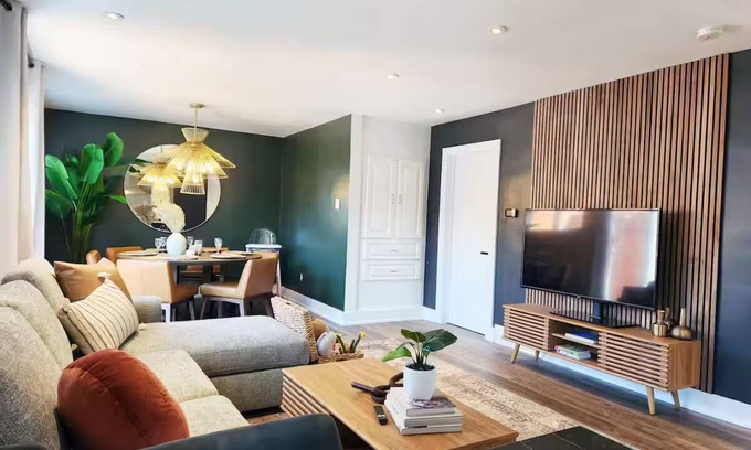 Enjoy a luxurious sleep in a Queen sized pull out sofa. the Sofa brd is fitted with premium plush bedding, multiple pillows, and some cozy robes and slipper! This room includes a 50" smart TV with access to Netflix, Disney+, and Prime Video. *please note that this is in a common space (living room) with adjoining kitchen and dining room. This is not a separate bedroom.