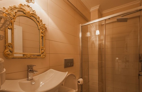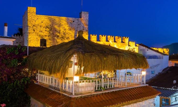 Greenhouse: This house will give you more comfort in the historic atmosphere with large rooms and terraces. On the ground floor there is a large kitchen, a living area and an extra bathroom. In the kitchen, there are all kinds of kitchen stuff, oven, tea and coffee machines and washing machine. On the 2nd floor you have a bedroom and bathroom and a large central terrace. Your dining table, swinging chair and sunbeds here will make you feel wonderful in the colorful flowers. You can watch the sea and castle view from the seating areas in our covered top terrace. (total 100m2, capacity 3-4 people)