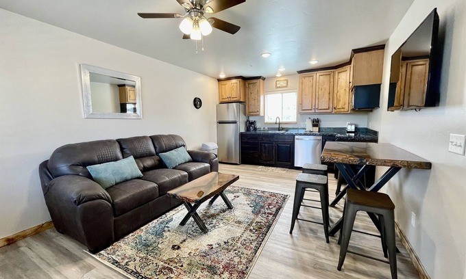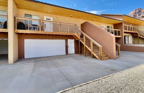 Angel Rock Rentals of Moab #8 is a brand new cozy, dog friendly, and modern rustic townhouse that sits over a 2 car garage. Perfect for couples! Angel Rock Rentals of Moab is located just 4 miles South of down town Moab. Get a refreshing nights rest in our comfortable queen size bed. The kitchen is well equipped with everything you'd need for a home cooked meal or use the electric patio grill. Take advantage of the garage to safely store the toys.