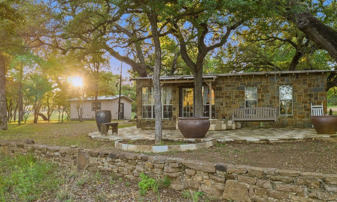 Rock cabin privately situated on Comanche Creek with 80+ acres available to roam freely. Tucked away among hertiage live oaks and towering cedar elm trees is a 2 bedroom (King & Queen Beds respectively), 1 bath cabin (with walk-in shower) just 25 mins to Horseshoe Bay, 45 mins to Fredericksburg and about an hour from Austin. The cabin comfortably sleeps 4 and offers a full size kitchen. Enjoy the peace of being surrounded by nature among wild turkeys and grazing deer. Feel free to hike around the acreage or use the buggy to cruise about. Head into town for dinner or grill out on the patio, there’s no better way to kick your heels up and recharge. Exceptional stargazing!