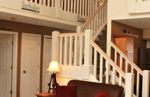 Upper floor: Three bedrooms. First bedroom is an enclosed loft bedroom with a queen bed and TV with DVD player. Second bedroom has full trundle bed on top with twin pull out underneath. New flat screen TV. This bedroom also has another twin bed. Third bedroom has a queen and a twin bed. Full bath with double sinks and a new flat screen TV.